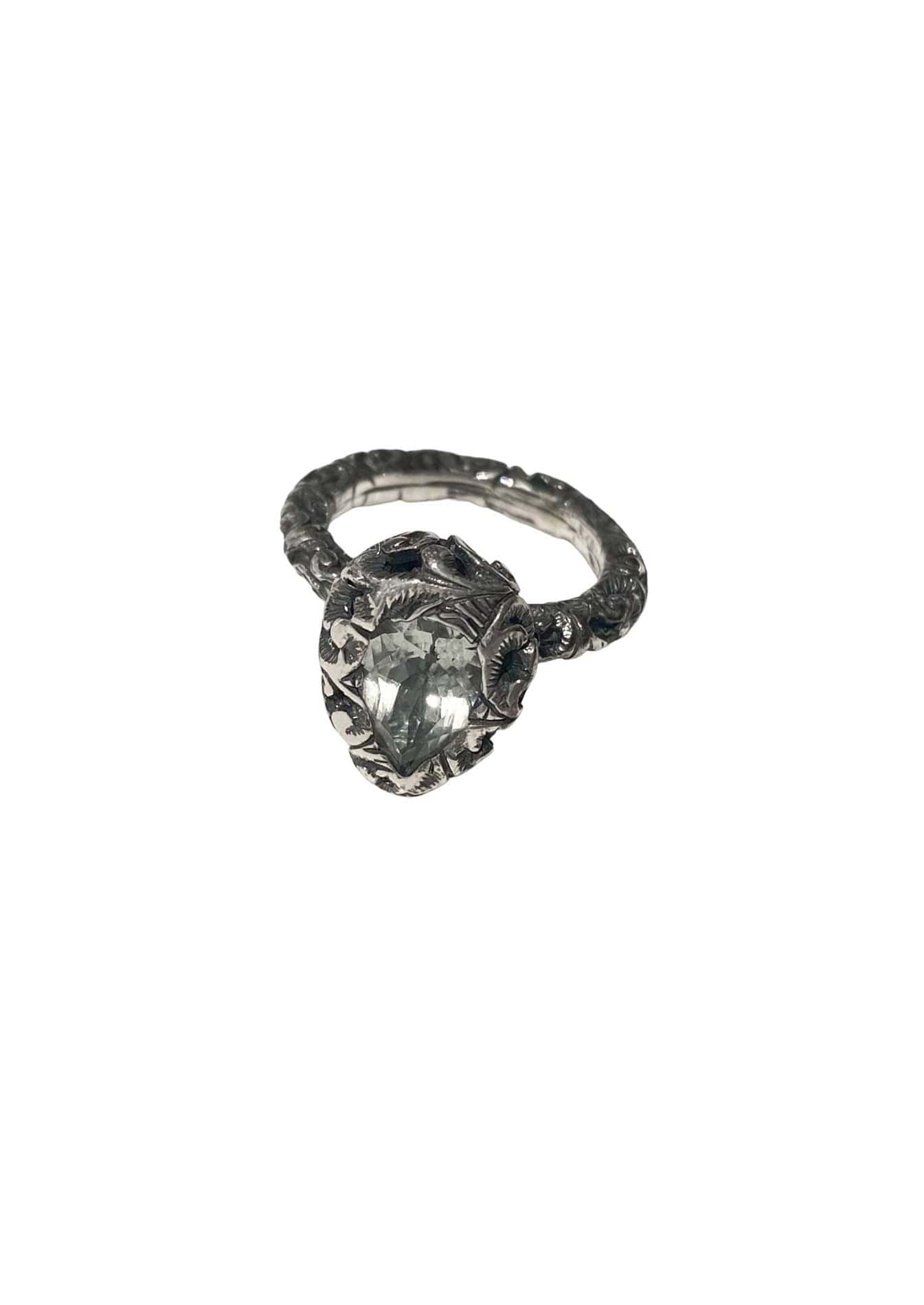 Anello Maria e Luisa in argento brunito con pietra a goccia cristallo di rocca, inciso a mano con l’antica tecnica del bulino, misura 12 scarso.