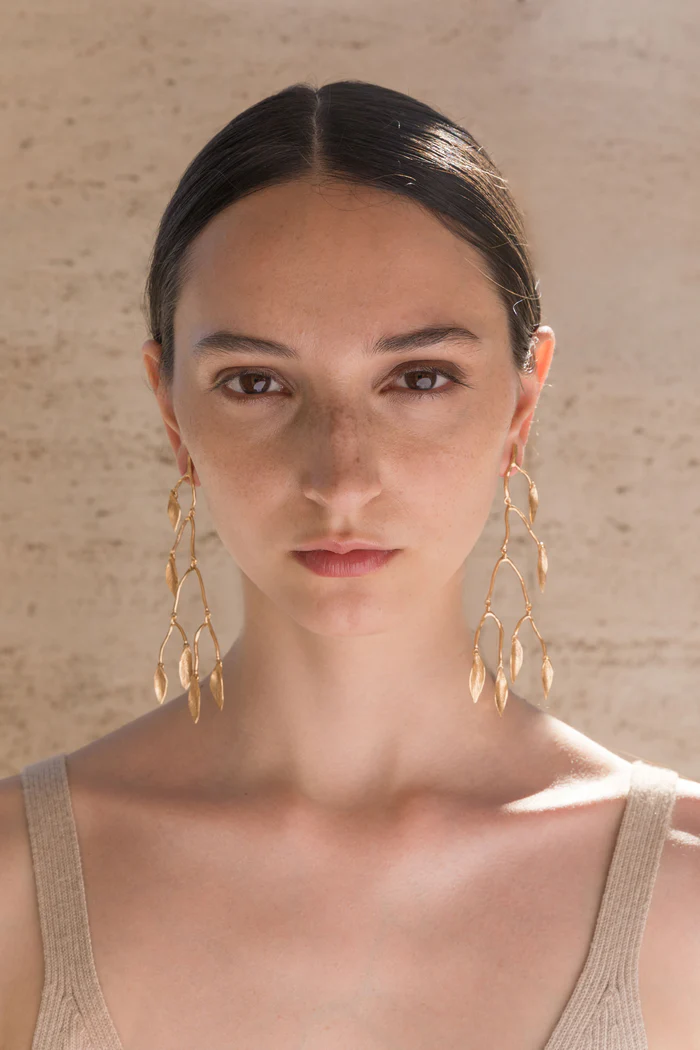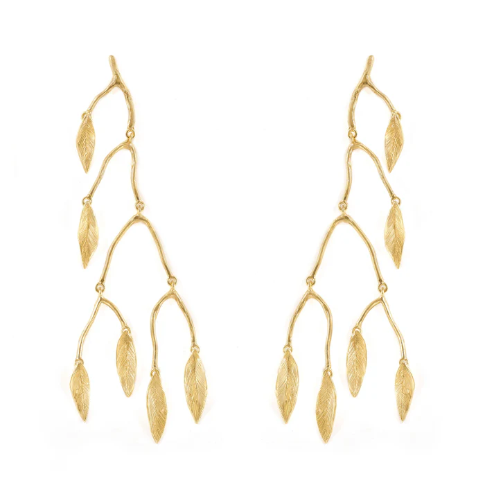 Orecchini Mobile Leaves di Giulia Barela, altezza di 13 cm, chiusura a farfallina, bronzo placcato oro 24kt. Referenza: A9715