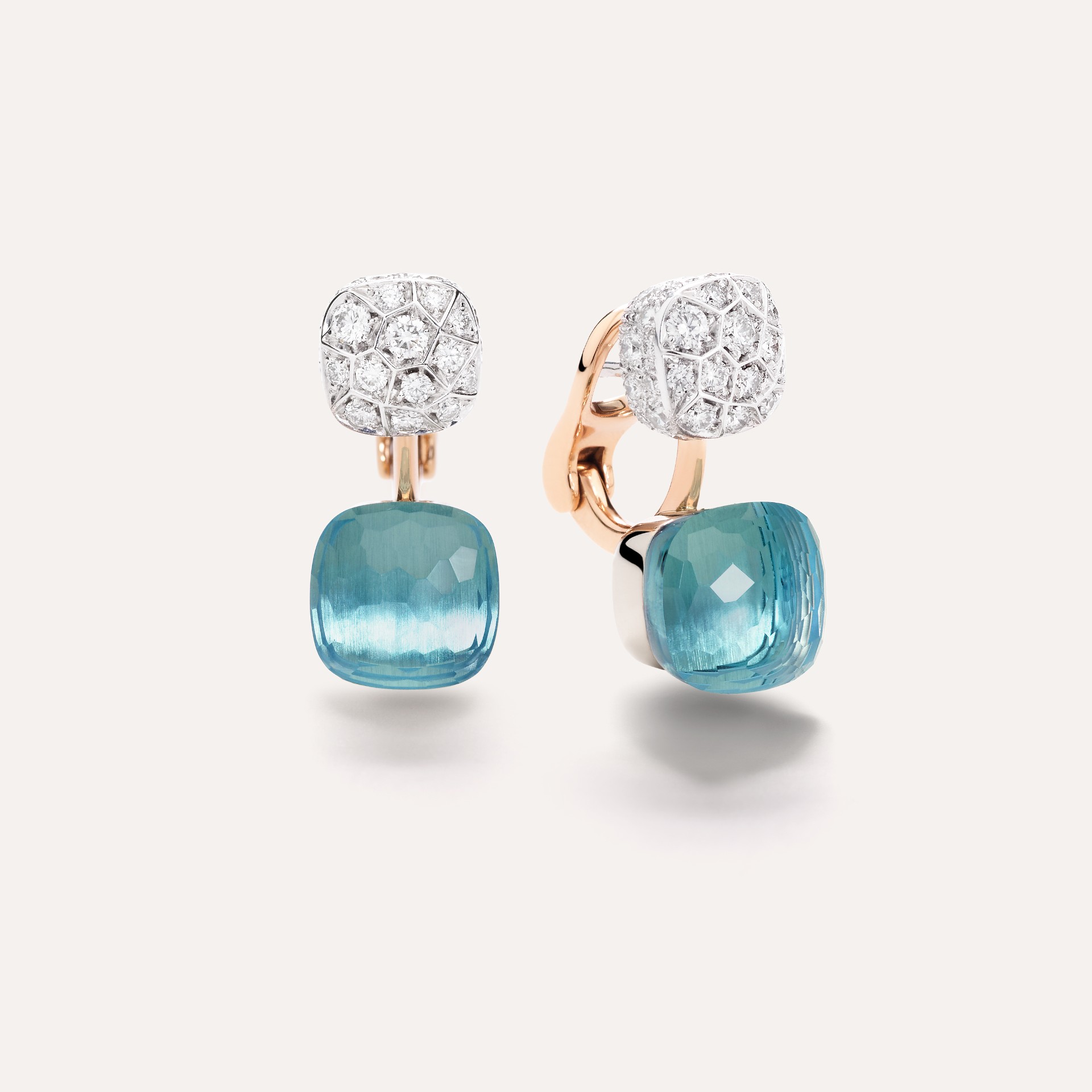 Orecchini Pomellato della linea Nudo in oro rosa e bianco 18kt con 2 topazi azzurri (≈18 ct) e 76 diamanti bianchi (≈1.5 ct) su oro bianco rodiato 18kt.
